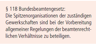 Wegen der hergebrachten Grundsätze des Berufsbeamtentums gilt die Koalitionsfreiheit nach Auffassung des Bundesverfassungsgerichts für Beamtinnen und Beamte jedoch nur eingeschränkt. Beamtinnen und Beamte haben kein Recht zu streiken, da dies mit der Neutralität der Amtsausübung und einer loyalen Pflichterfüllung nicht zu vereinbaren sei. Als Ausgleich für diese Grundrechtsbeschränkung wurde ein kollektives Beteiligungsrecht in § 118 BBG geschaffen. Dieses Beteiligungsrecht nehmen die Spitzenorganisationen der Gewerkschaften wahr. Es gilt bei der Vorbereitung aller beamtenrechtlichen Regelungen. Darunter sind nicht nur Gesetze und Rechtsverordnungen, sondern auch Verwaltungsvorschriften, Richtlinien oder Erlasse zu verstehen. Beteiligung bedeutet nach der derzeit herrschenden Rechtsauffassung mehr als eine Anhörung, aber keine uneingeschränkte Mitbestimmung.