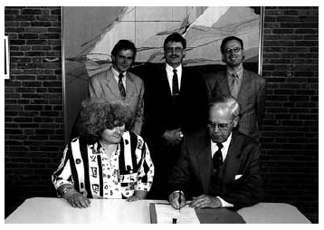 Ein Meilenstein bei der Verankerung der Vertragsidee im Beamtenrecht: Unterzeichnung des öffentlich-rechtlichen Vertrages zwischen BMI und DGB. Im Bild: Regina Görner damaliges DGB-Vorstandsmitglied mit dem ehemaligen Bundesinnenminister Manfred Kanter. In der hinteren Reihe: Günter Heidorn (damaliges Vorstandsmitglied der Deutschen Postgewerkschaft), Egbert Biermann (damailiger DGB Abteilungsleiter Beamte) und Holger Unland (damaliger ÖTV-Bundesbeamtensekretär).